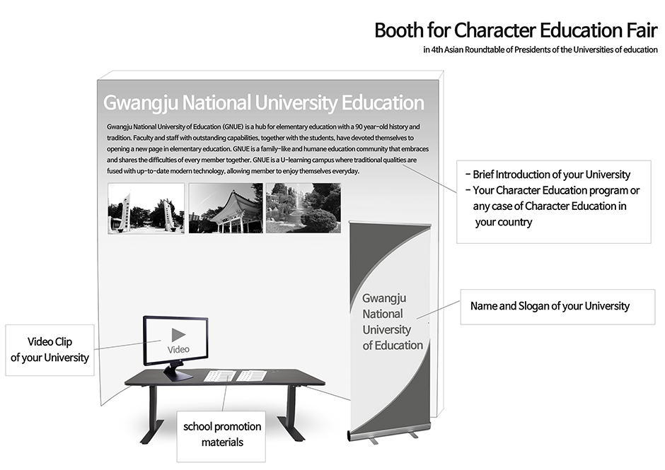As a part of this Round Table, an education fair during the event period is scheduled to be held at Punghayng Cultural Center, Gwangju National University of Education. Gwangju National University of Education is to set up a separate booth for the participating universities. We could share or promote our unique experiences and information of Character Education through this booth. If you needs any staff to operate your booth, our student ambassadors are ready to support you. For your booth, you should submit the following materials.